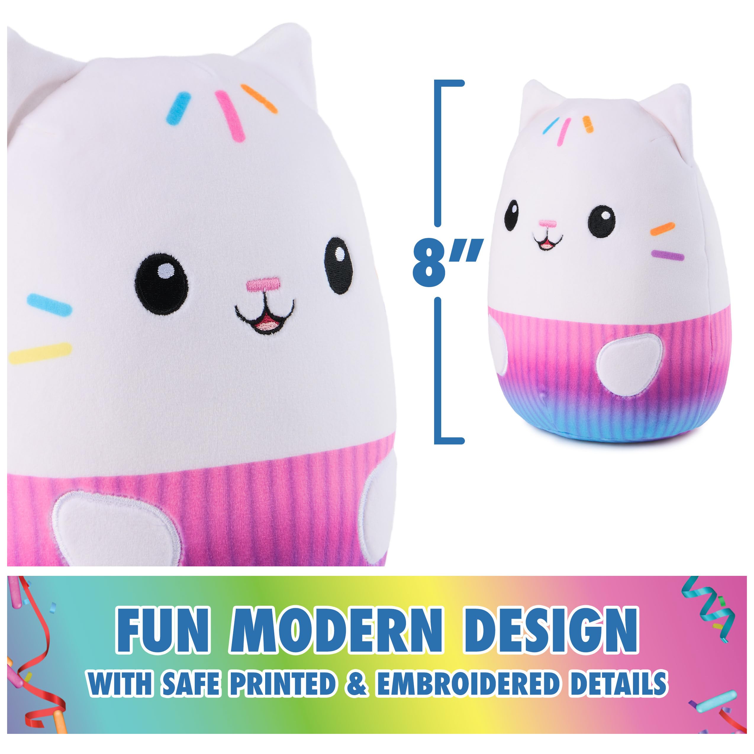 - CAT-TASTICALLY HUGGABLE: Time for a squishy sprinkle party Cakey Cat is here as a huggable, squishable 8” plush toy with show-accurate characters details, including soft white plush speckled with rainbow sprinkles